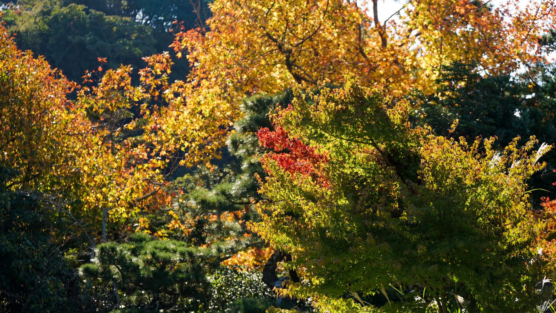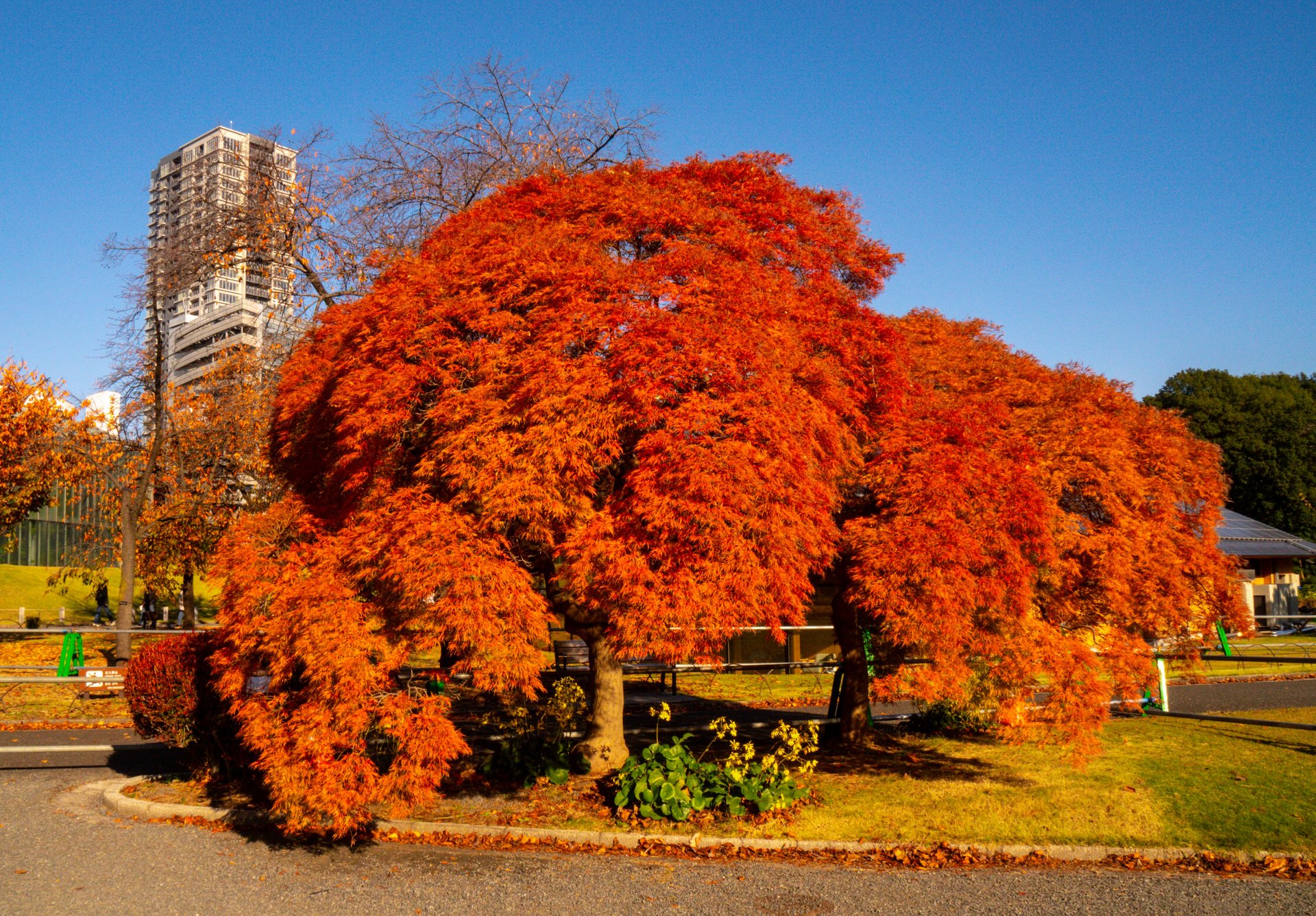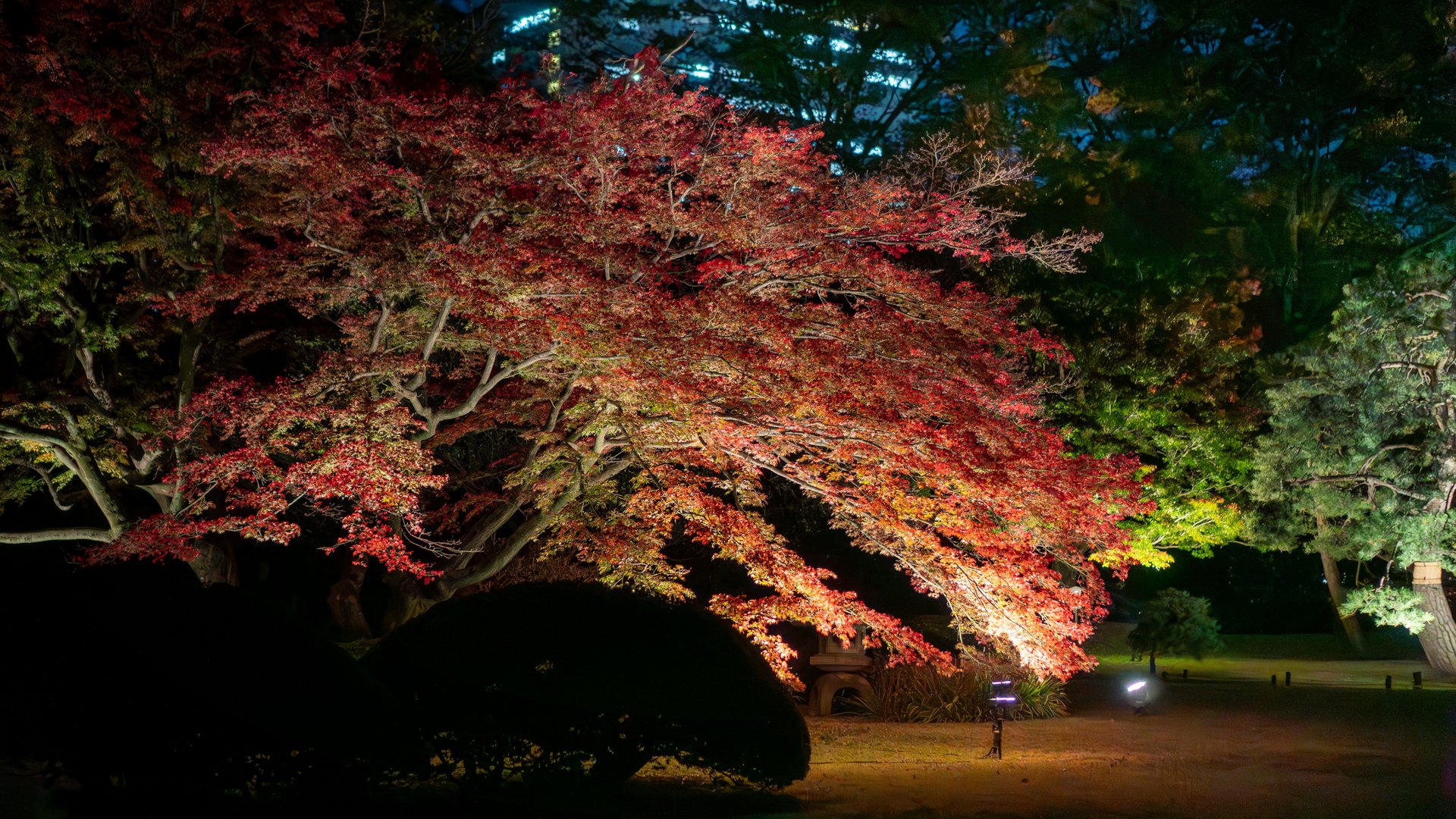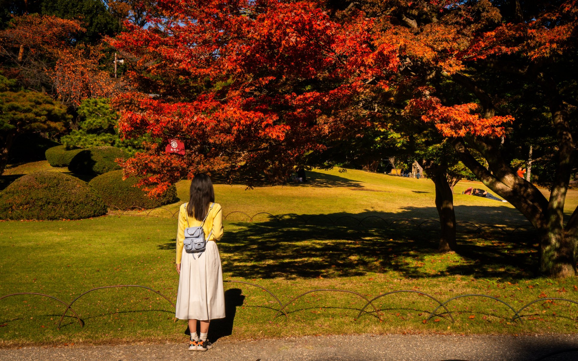 Tuttavia, è possibile apprezzare i vari colori del momiji anche in altre aree del parco, poiché i giardini ospitano numerosi alberi di ginkgo e altre specie distribuiti in tutto lo spazio.