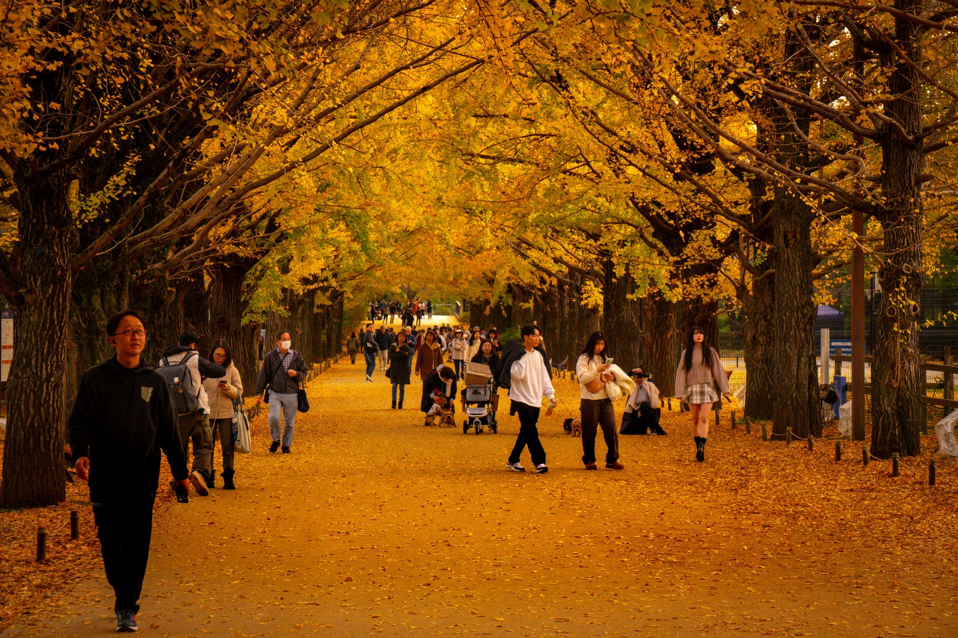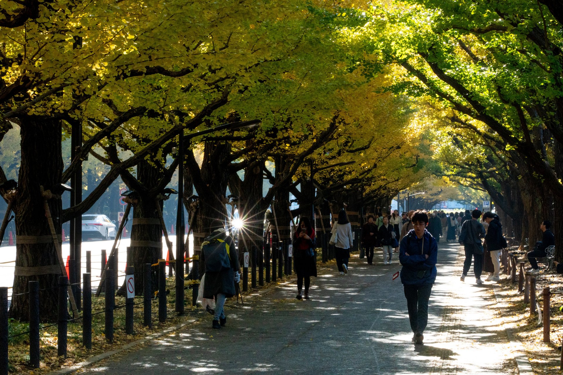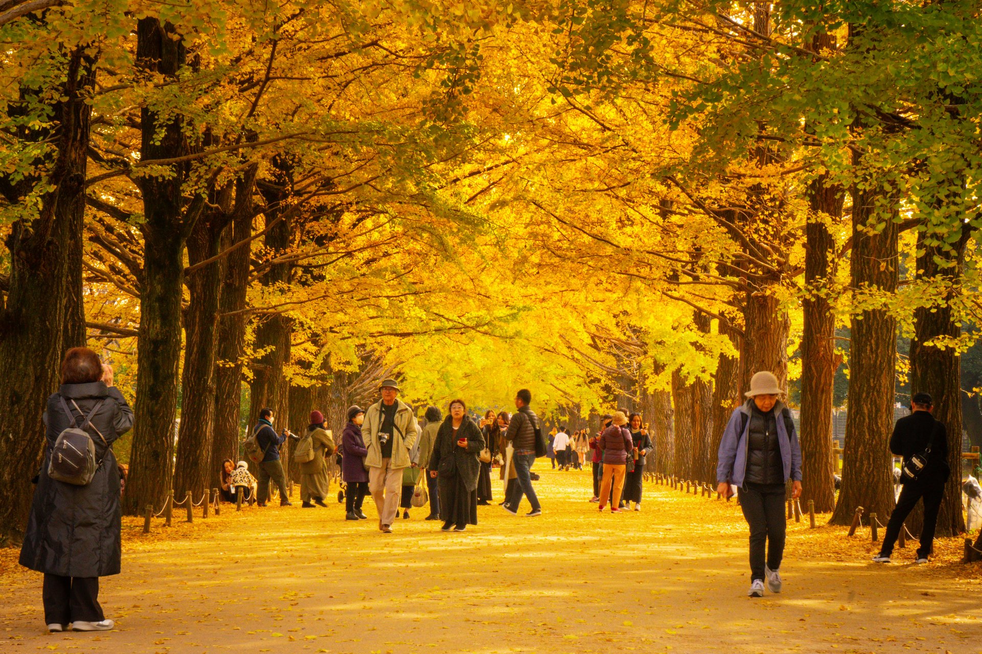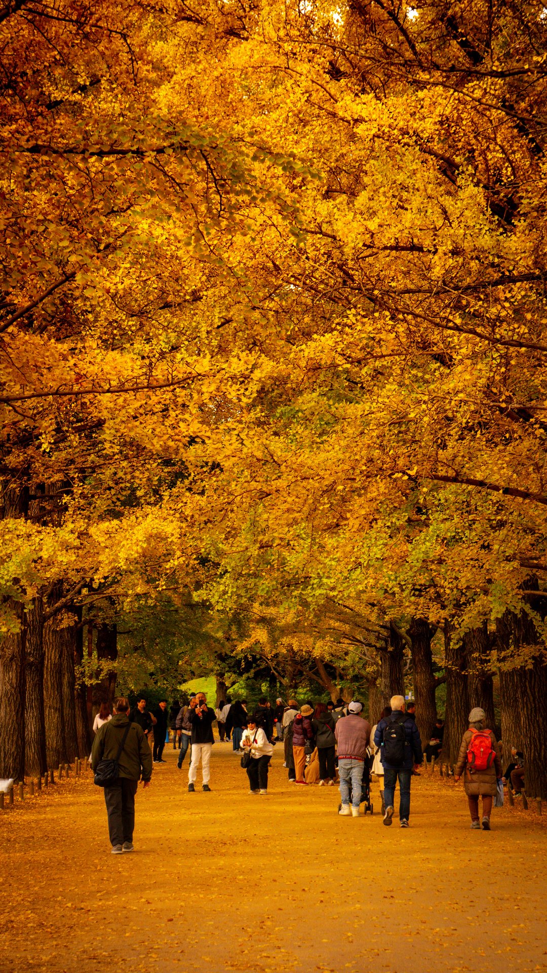 Le foglie dorate dei ginkgo creano un’atmosfera incantevole, attirando sia i locali che i turisti che passeggiano lungo l’avenue per godere della bellezza del paesaggio.