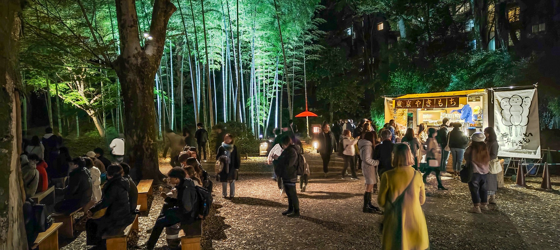 All’arrivo del crepuscolo, è possibile ammirare come l’ambiente cambi con le luci del tramonto, mentre gli alberi si illuminano progressivamente, creando un’atmosfera incantevole e unica a Tokyo.
