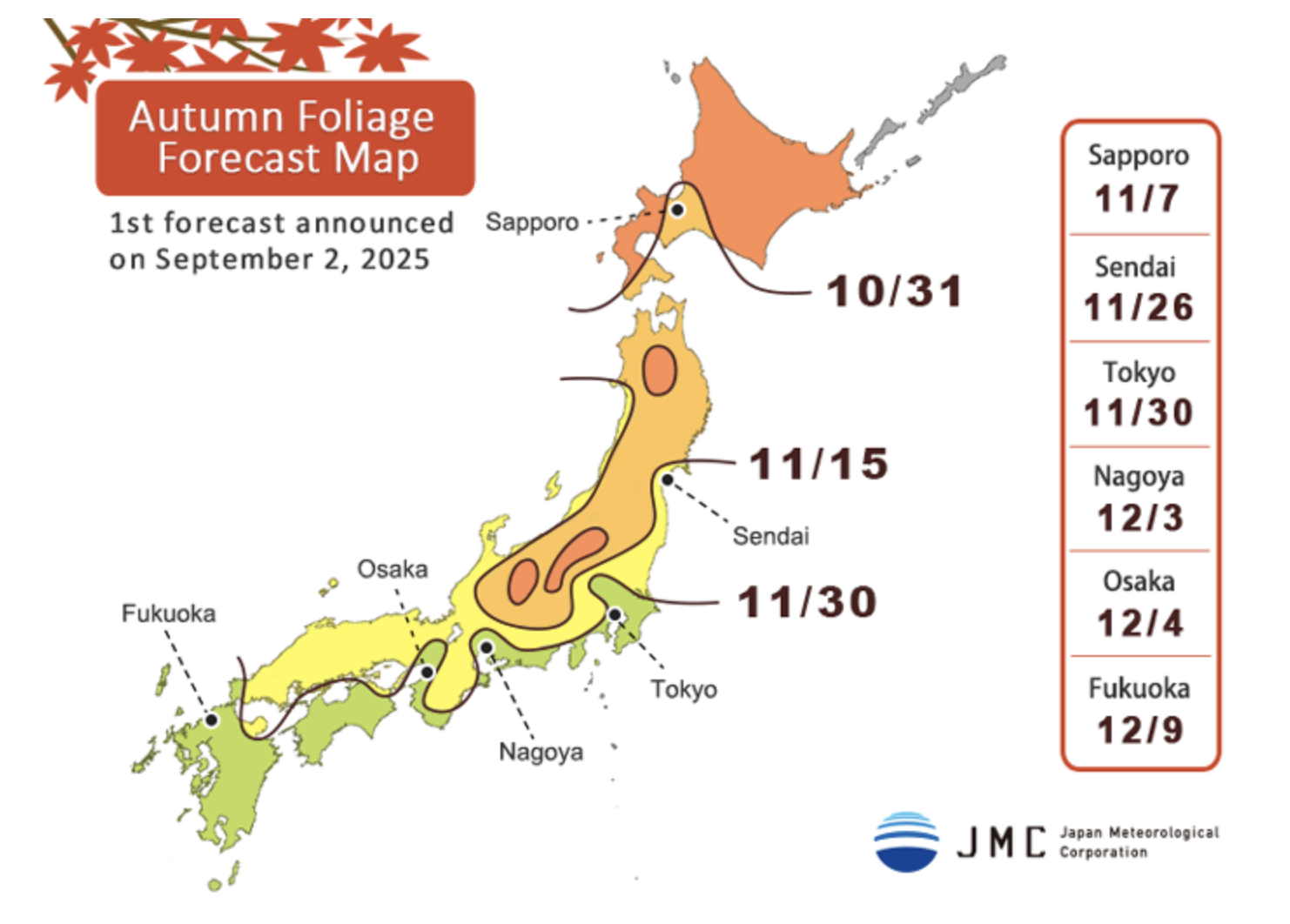 Ogni anno, l’Agenzia Meteorologica del Giappone pubblica le previsioni del Momiji, un fenomeno naturale molto atteso nel paese che si riferisce al cambiamento di colore delle foglie in autunno, specialmente quelle degli aceri.