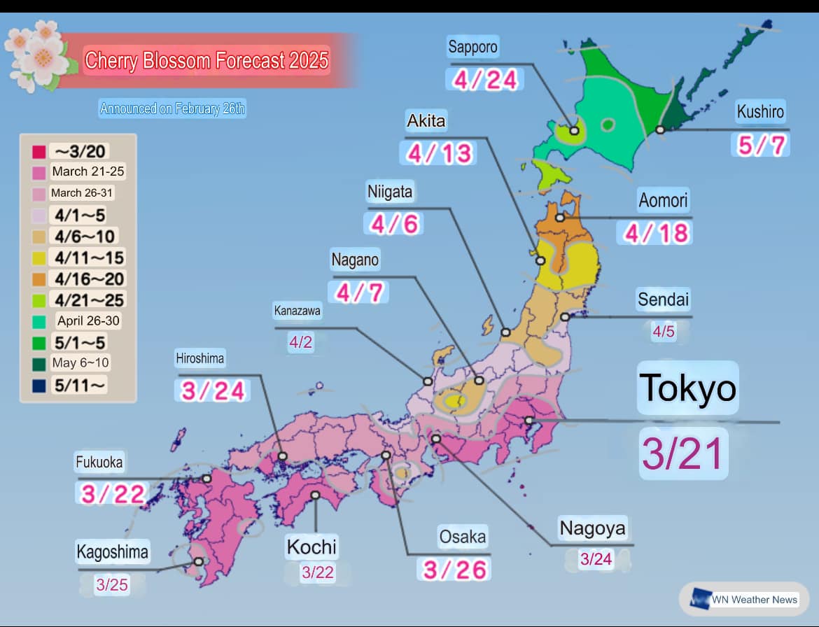 La Agenzia Meteorologica del Giappone suscita ogni anno grande attesa annunciando le previsioni per il sakura, ovvero la fioritura dei ciliegi.