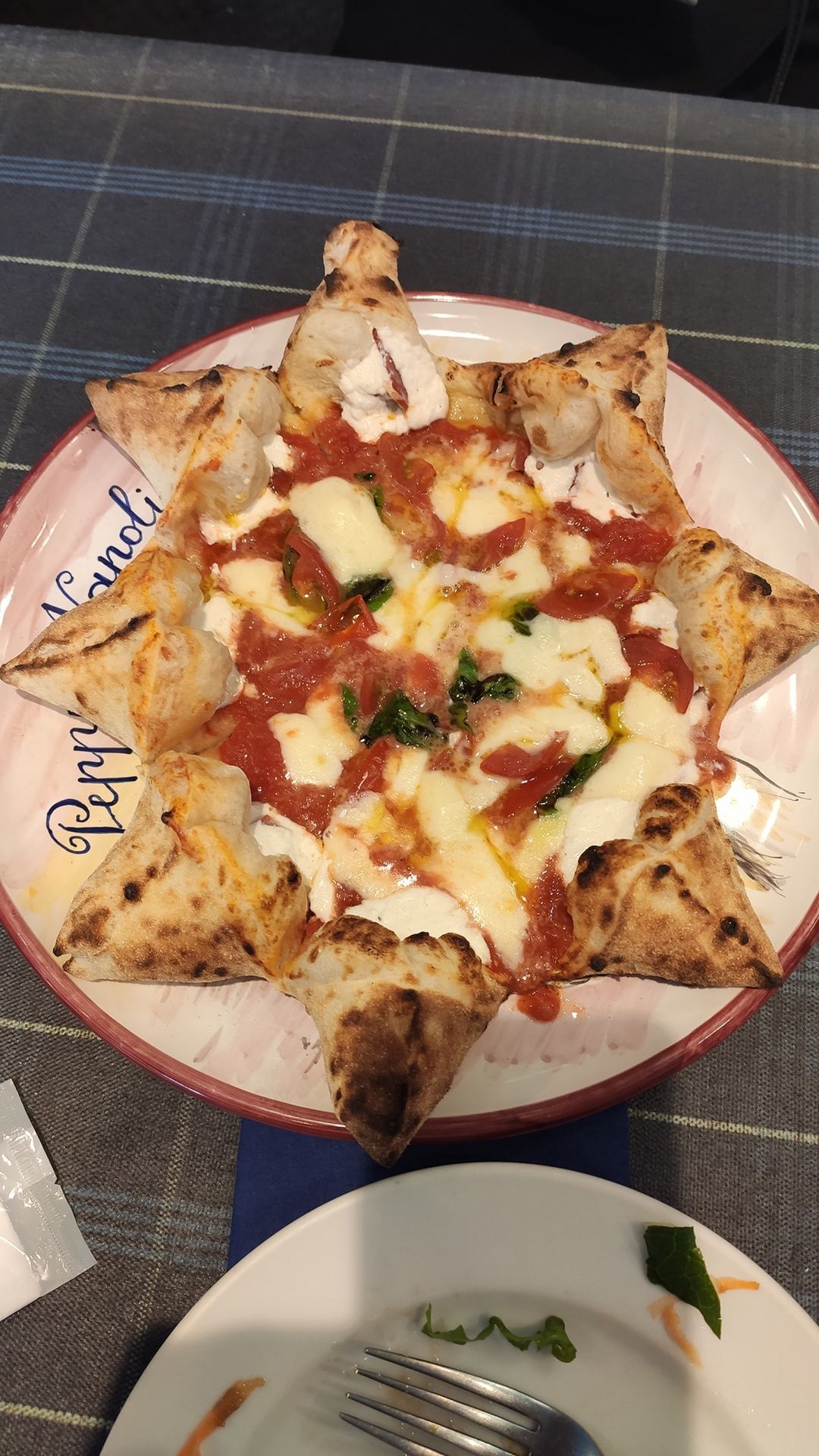 Questa pizza speciale ha una forma a stella con ricotta sulle punte, offrendo un sapore e una presentazione che delizieranno i tuoi sensi.