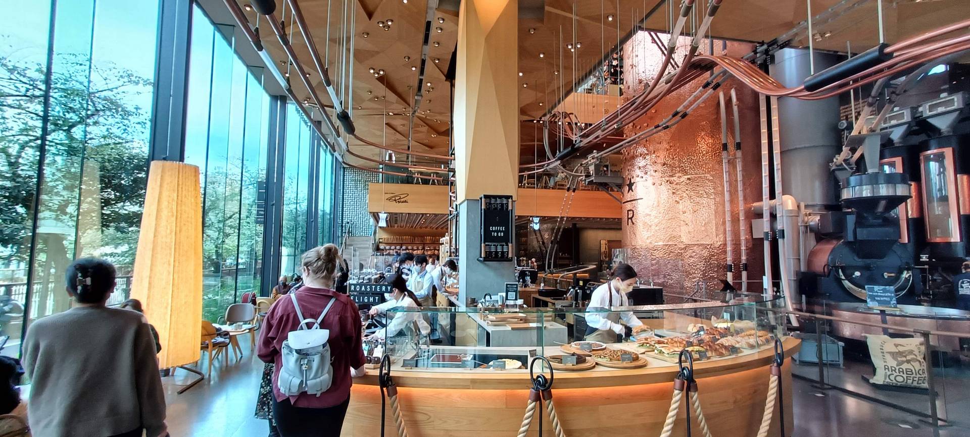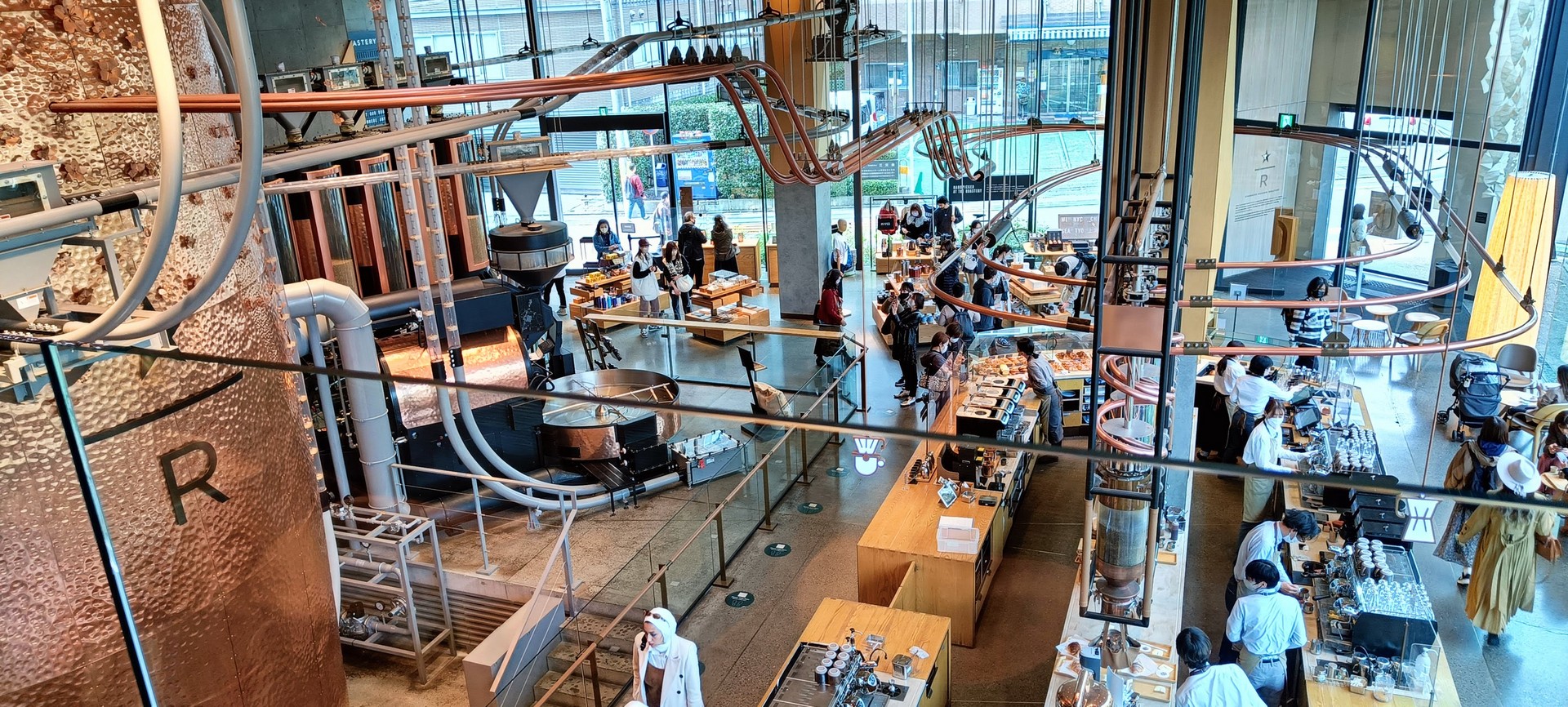 Il design dello Starbucks Reserve Roastery è impressionante, con un interno spazioso ed elegante che fonde elementi moderni con tocchi della tradizione giapponese.